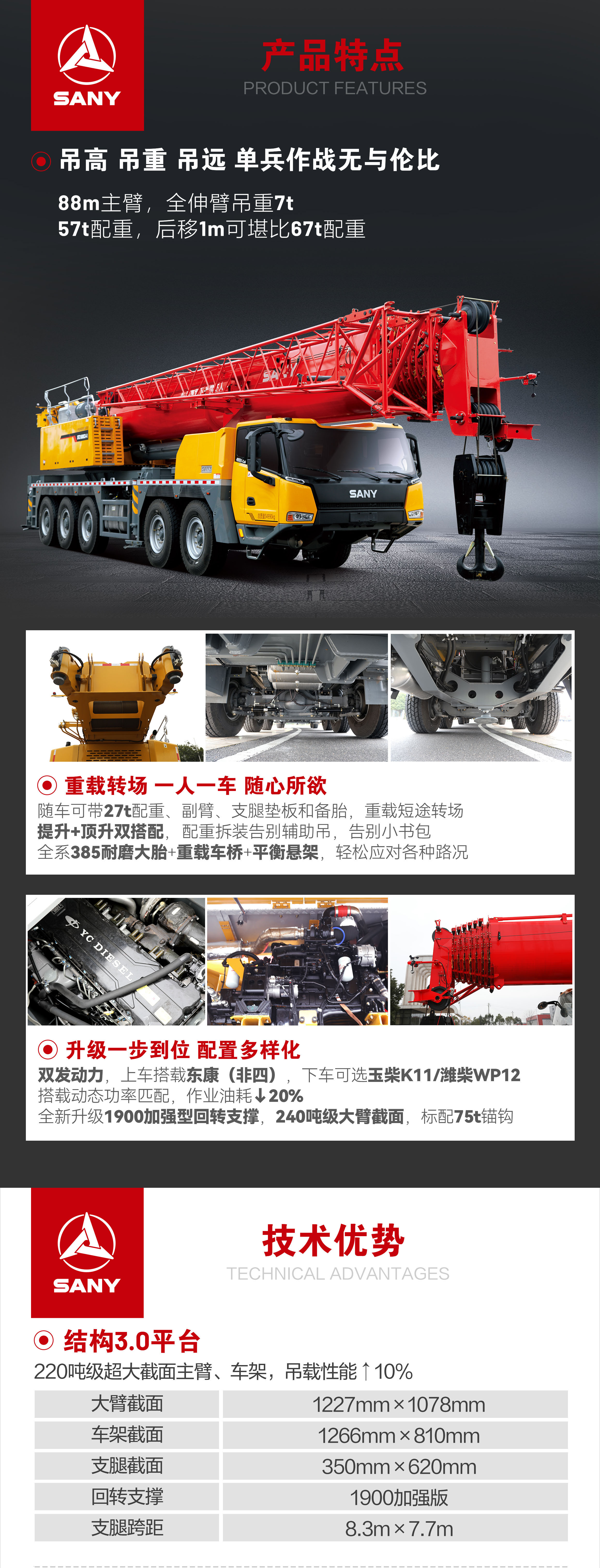 全新(xin)升级1900加(jia)强型回转支撑,220吨级大(da)臂截面,标配(pei)75t锚钩