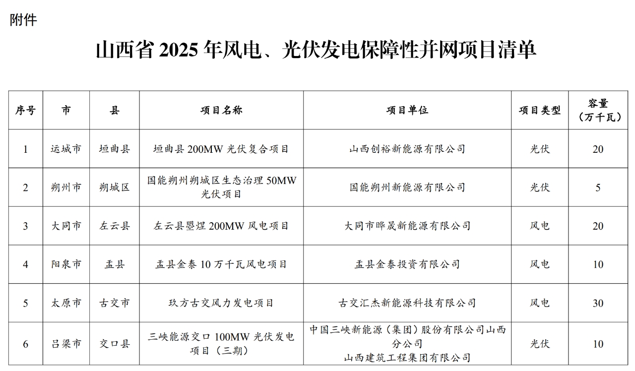 3.35GW!山(shān)西公(gōng)布2025年(nian)风電(dian)、光伏髮(fa)電(dian)保障性并网項(xiang)目(mu)清(qing)單(dan)