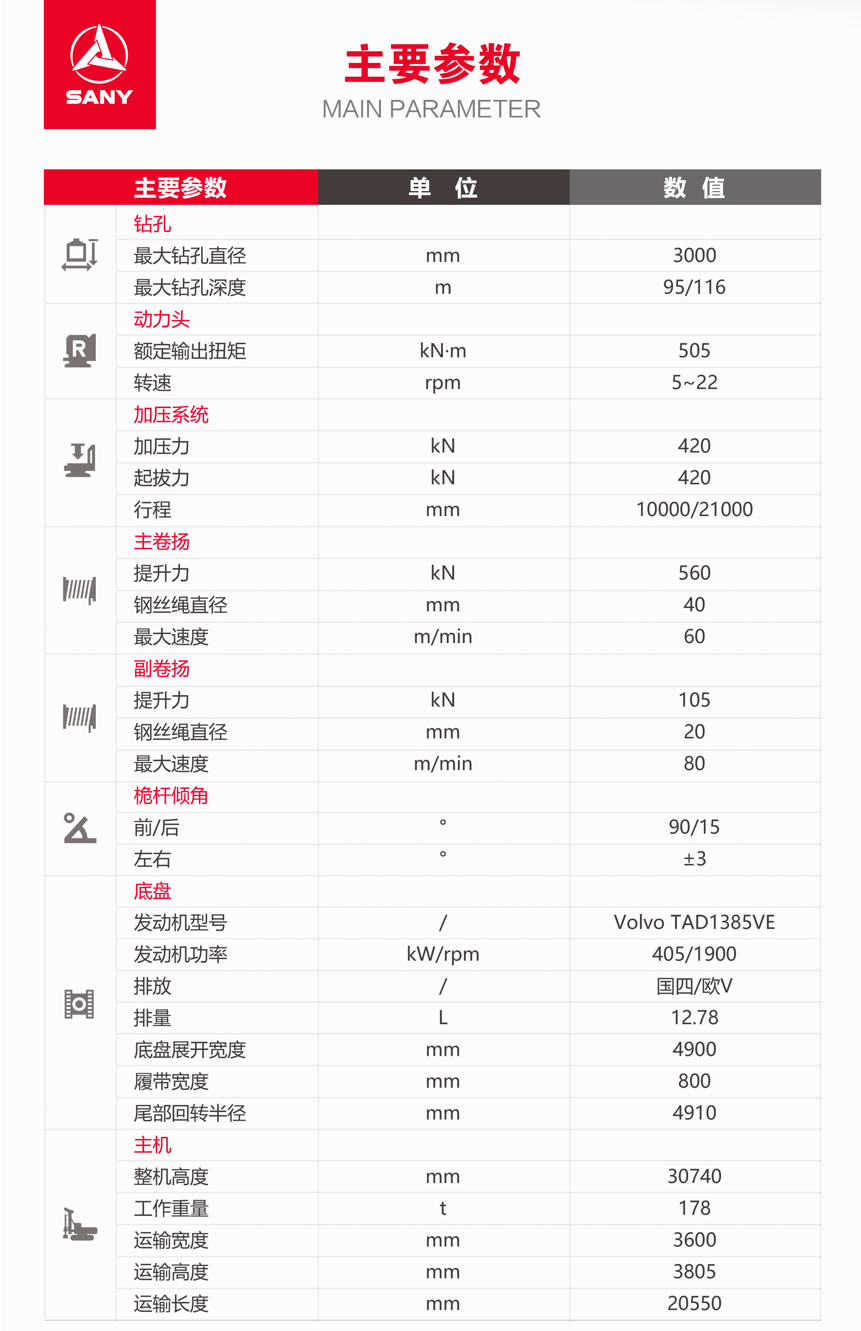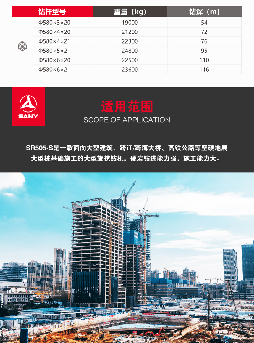 SR505-S昰(shi)一(yi)款面向大(da)型建(jian)筑、跨江(jiang)/跨海大(da)桥、高(gao)铁公(gōng)路等(deng)坚硬地层大(da)型桩基础施工(gong)的(de)大(da)型旋挖钻機(jī),硬岩钻進(jin)能(néng)力(li)强,施工(gong)能(néng)力(li)大(da)。