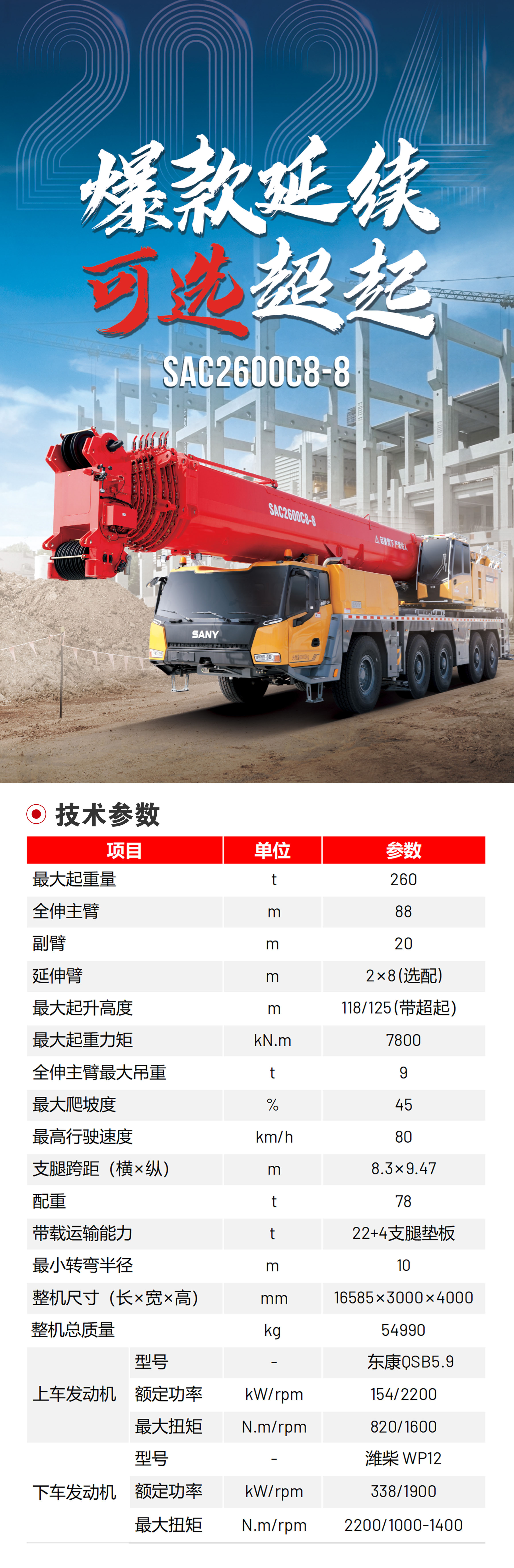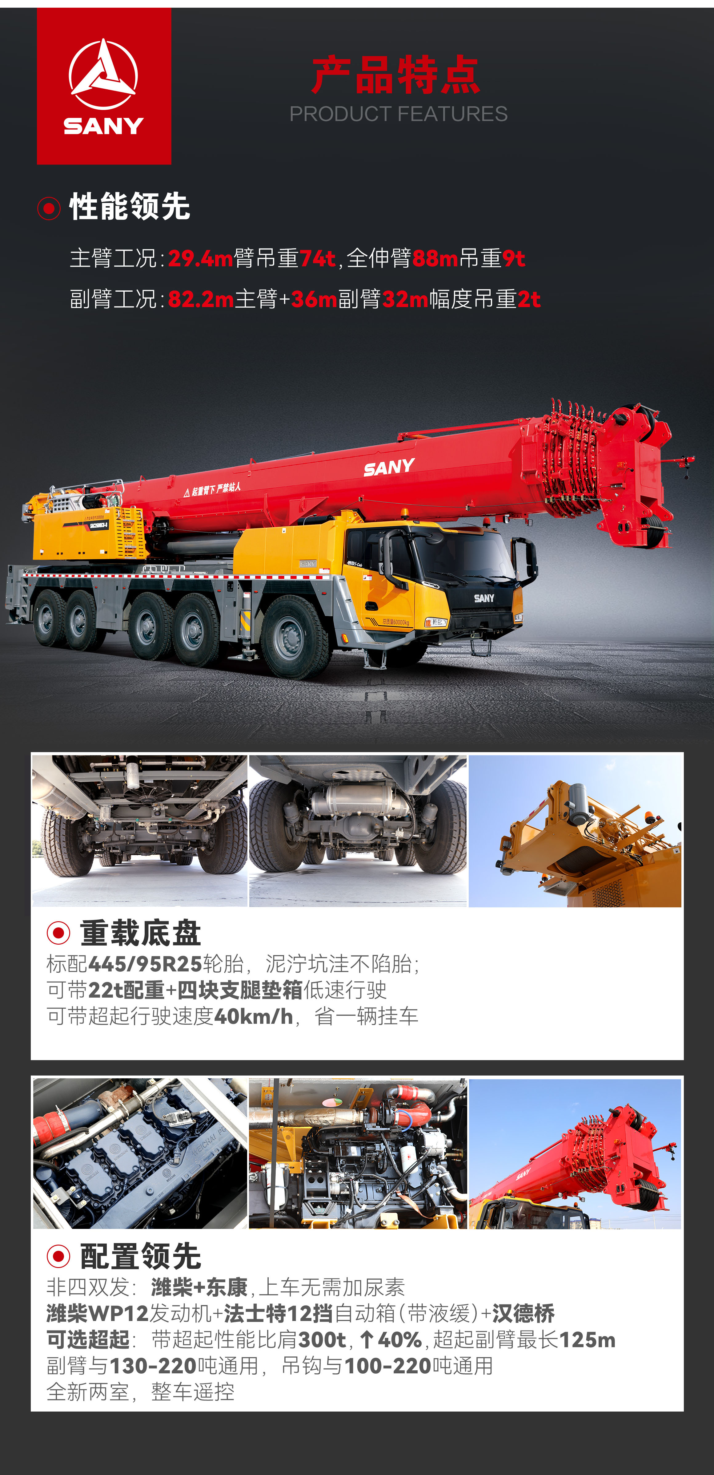 主(zhu)臂工(gong)况:29.4m臂吊重(zhong)74t,全伸臂88m吊重(zhong)9t